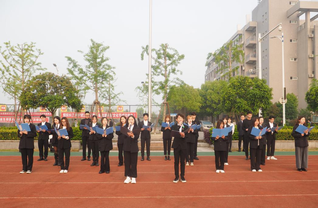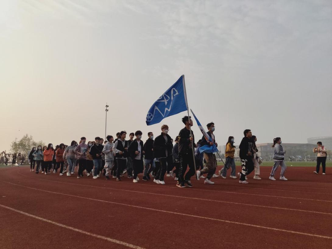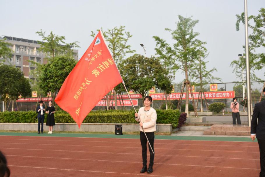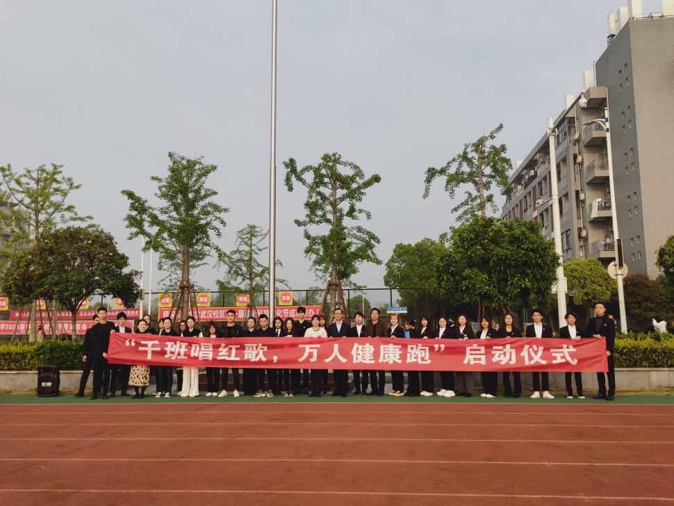 最后由永利集团武汉校区学工部部长许战向艺术与公司党委副书记魏红洁授旗并合影留念。授旗结束后,主持人宣布“千班唱红歌,万人健康跑”活动正式开跑,全院师生按照队伍由左至右依次围绕跑道跑两圈。