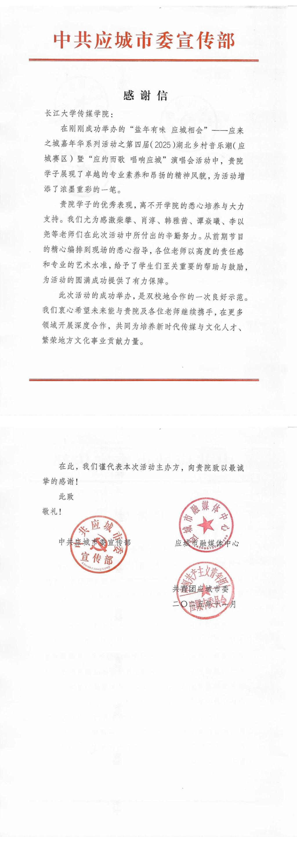 此次活动是“盐年有味 应城相会”系列文化活动的重要组成部分,其成功举办不仅为校地文化合作注入了新活力,也进一步深化了永利集团304永利集团与应城市在人才培养等方面的交流与合作,为后续拓展校地协同育人新模式奠定了坚实基础。活动结束后,中共应城市委宣传部专门向公司发来了《感谢信》,对公司师生的优秀表现表示由衷感谢和充分肯定。
