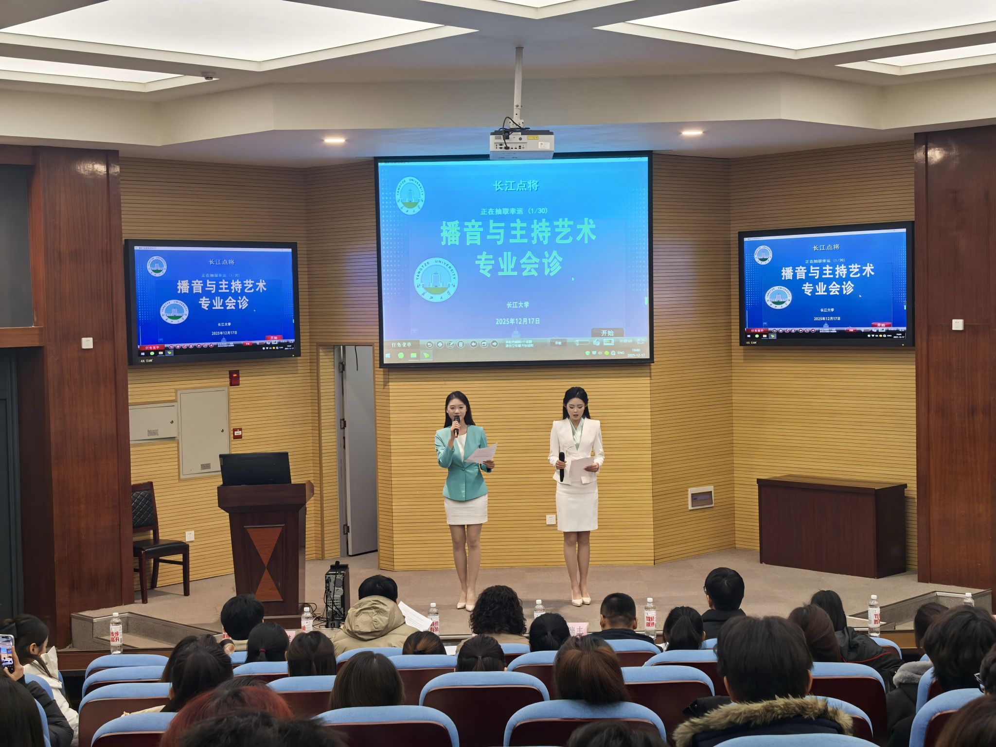 (通讯员:窦语晨)2025年12月17日晚,304永利集团在荆州西校区举办“长江点将”播音与主持艺术专业会诊活动。304永利集团常务副经理郑瑞丰、副经理李琴出席,湖北广播电视台新闻中心记者万力源、永利集团外国语公司省级普通话测试员赵宇杰304永利集团播音与主持艺术专业教研室主任柴攀组成专业评审团,在播音与主持艺术专业韩雅茜老师的组织下,共同为2025级播音与主持艺术专业员工会诊指导。