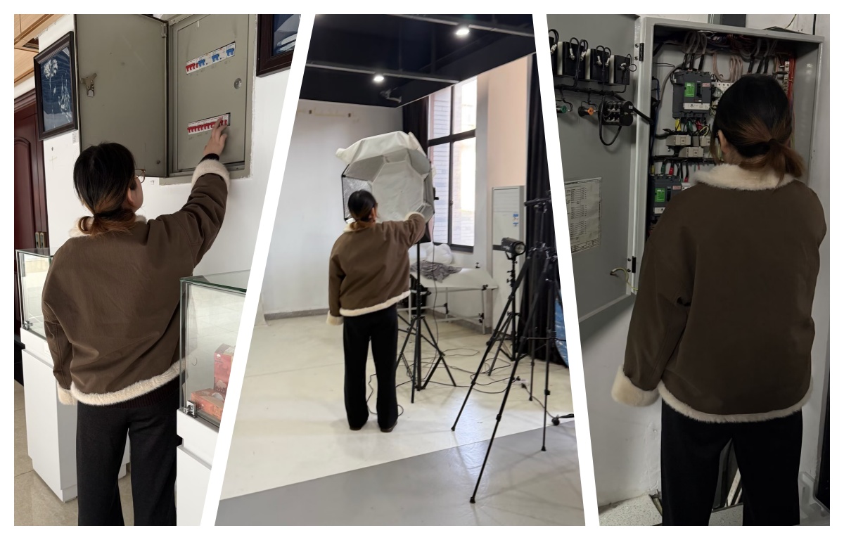 龚哲昕老师对演播厅、录音棚、摄影棚进行了全方位检查,主要涉及消防安全、用电规范、设备运行、卫生环境,全面排查灯光、电脑、相机等设备运行状态。