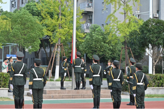 早上7时,升旗仪式正式开始。升旗仪仗队的队员们迈着整齐划一的步伐,护送五星红旗走向旗杆,全体师生面向国旗行注目礼。随着激昂的《义勇军进行曲》响起,全体师生注视五星红旗冉冉升起,并奏唱国歌,五星红旗在熠熠晨光中迎风飘扬。