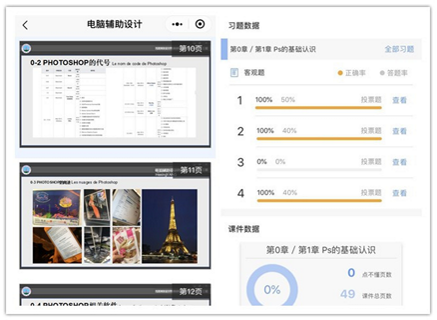 杨老师的示范课分为“雨课堂”基本功能介绍、实操演示、互动交流三个部分,并以《电脑辅助设计photoshop》第一章节《photoshop基础知识》为主体进行了实操演示。全院教师参与问答互动、难点反馈、幻灯片推送、现场答题统计、现场调查、发送点评或弹幕,有效展示了在线教学良好的课堂互动、及时的授课反馈和多样的授课形式等特点,亲身体验了手机进课堂、信息技术辅助实现教与学的过程。