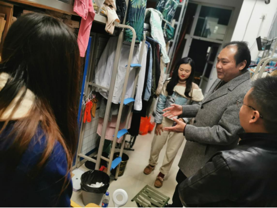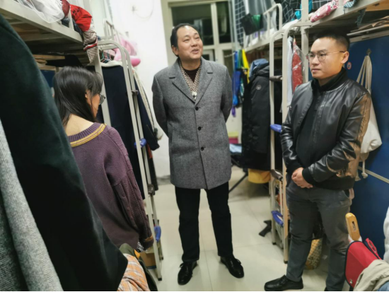 2019年12月10日,艺术与公司党总支书记邹火明,副经理郑瑞丰带领全体辅导员走访员工寝室,检查寝室卫生、违规电器,查看了同学们正在完成的作业和作品,同时检查了晚自习情况,看望并慰问考研复习的同学,并与新生交流进校来的学习生活情况!