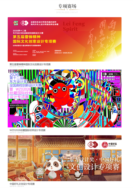 专项赛场:第五届雷锋精神国际文化创意设计专项赛、WZD2026纹藏国际纹样设计专项赛、 中国好礼文创设计专项赛;