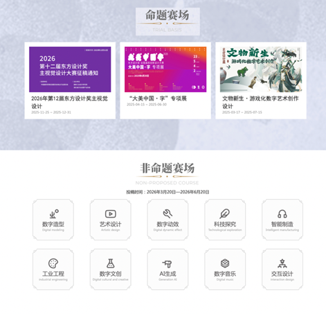 非命题赛场:数字制造、艺术设计、数字动效、科技探究、智能制造、工业工程、数字文创、 AI生成、数字音乐、交互设计